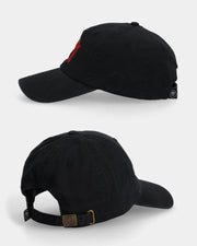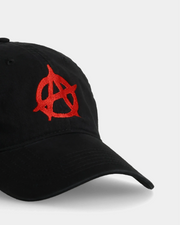 • Black dad cap with bold red anarchy symbol embroidered on the front.