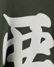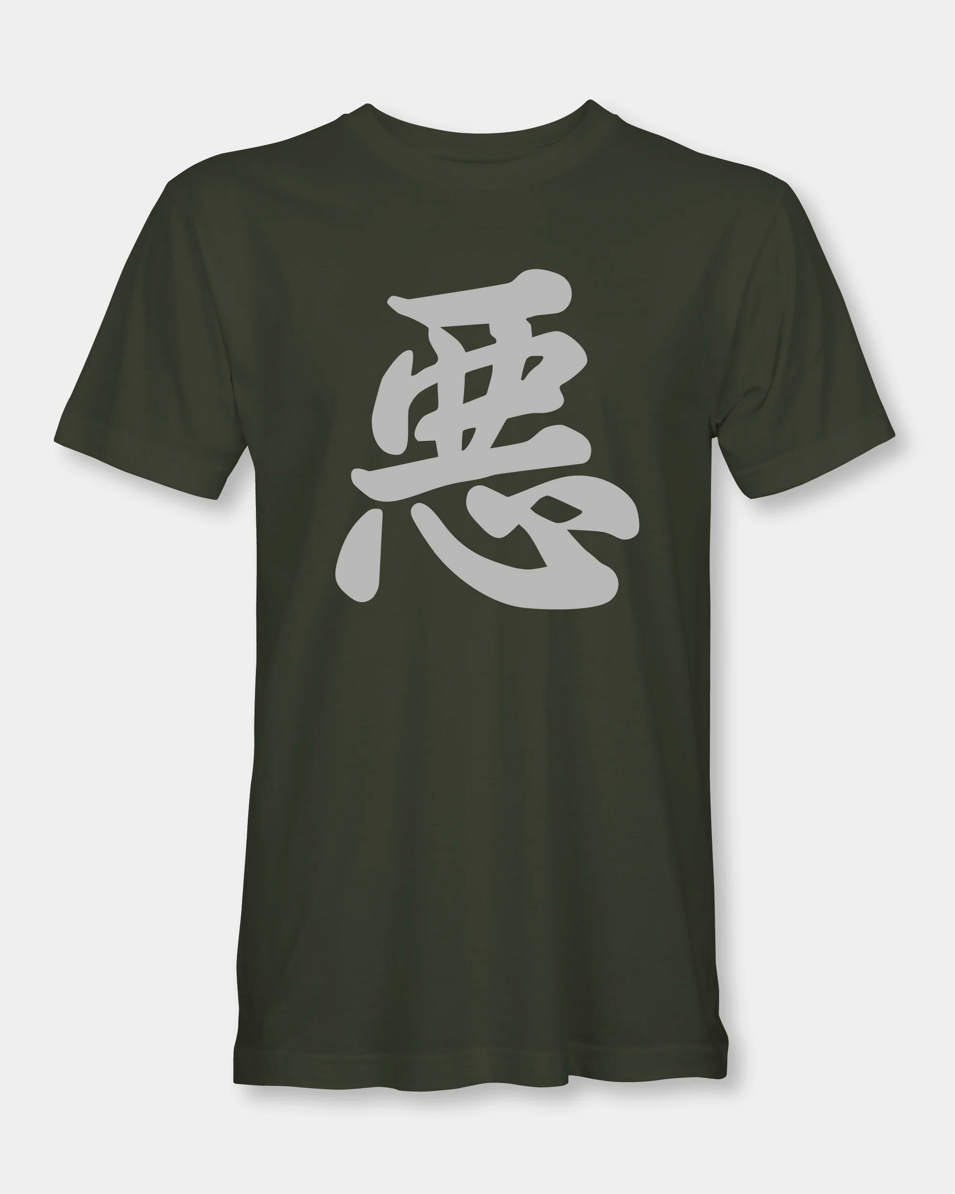 The kanji for “bad”, printed bold in mint on an olive men’s T-shirt. Regular fit, soft 180 GSM cotton-poly-viscose tri-blend, finished with a crisp heat transfer vinyl graphic.