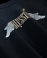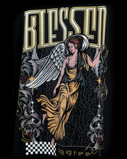 • Black Blessed oversized t-shirt graphic close-up with angel illustration, detail view