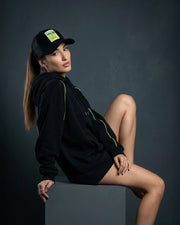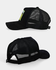 • Black trucker cap with Brandtrend patch, angled front detail view