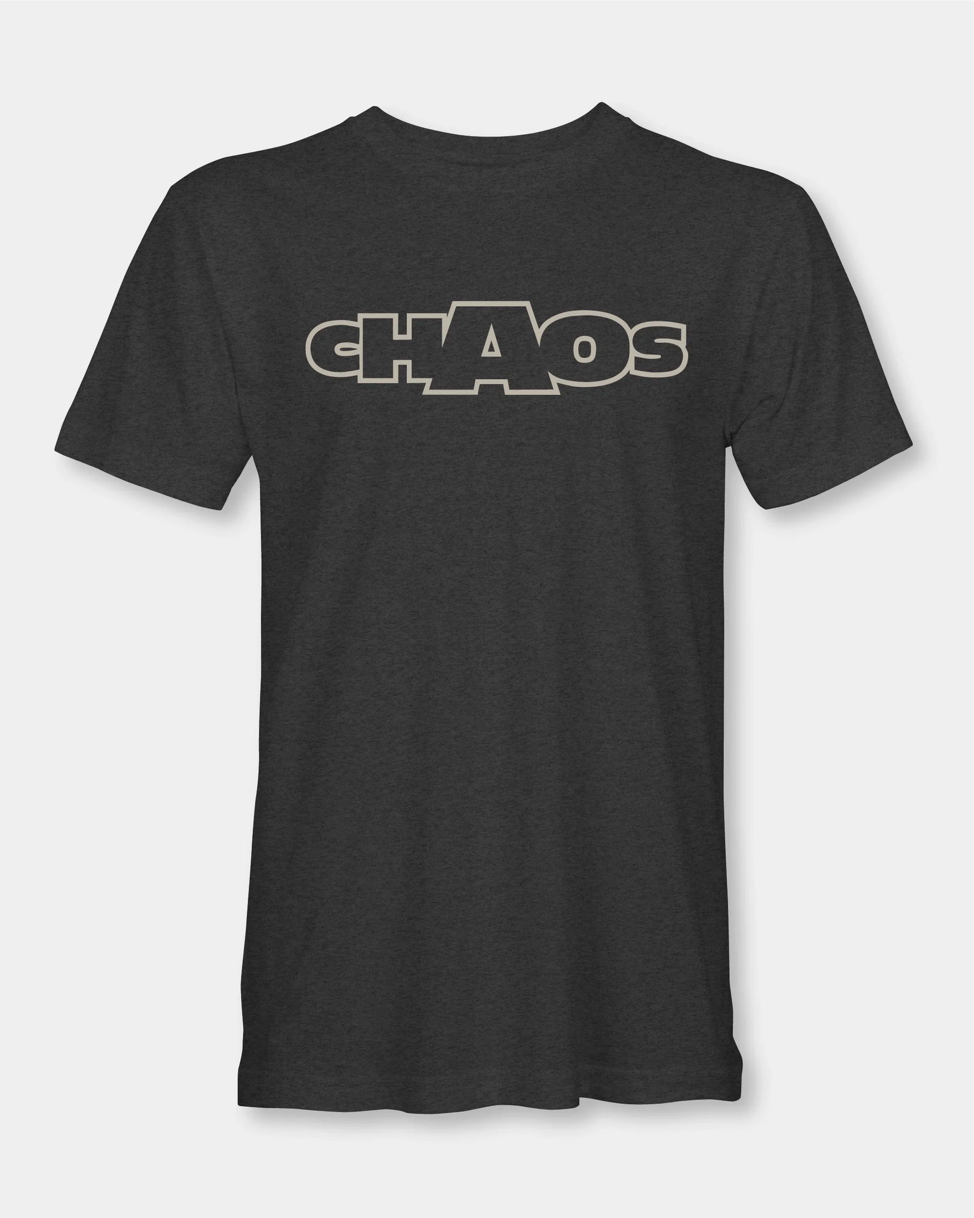 Bold “CHAOS” outline typography printed on charcoal melange. A regular fit men’s T-shirt in soft 180 GSM cotton-poly-viscose tri-blend, finished with clean heat transfer vinyl work.