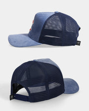 • Blue trucker cap close-up with C embroidered front detail