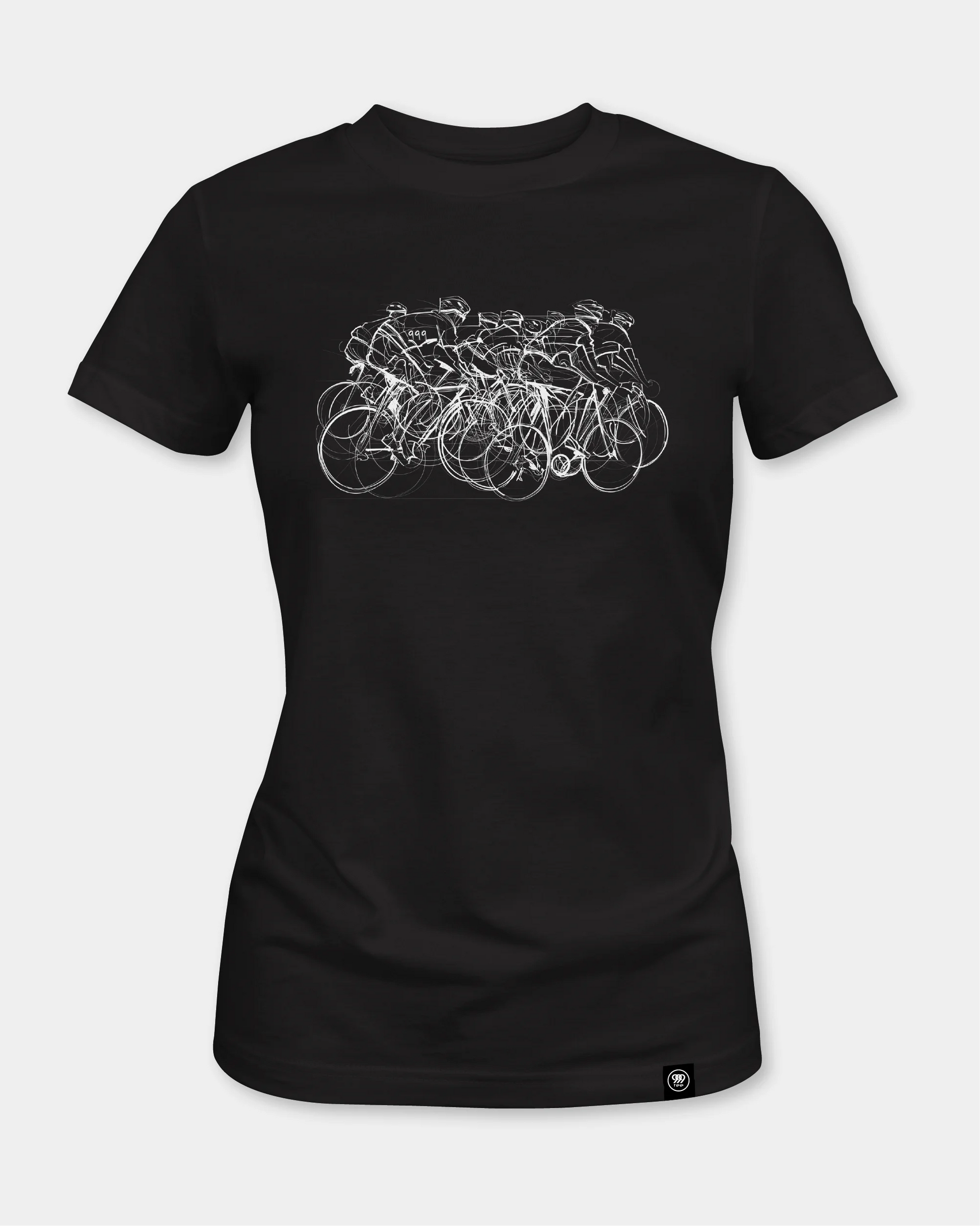 Experience the exhilaration of the open road with our "Cycling" Women's Black T-shirt. This stylish garment features a dynamic, artistic illustration of cyclists in motion, capturing the essence of the sport.