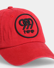 • Red dad cap close-up with black embroidered 999tee logo detail