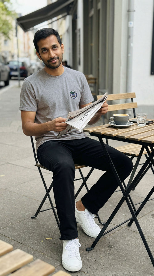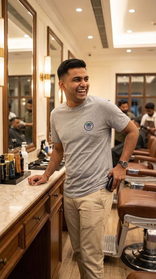 Experience the epitome of casual luxury with this premium 999Tee t-shirt. The soft, grey melange fabric and stylish design offer unparalleled comfort and style. A must-have for discerning men.