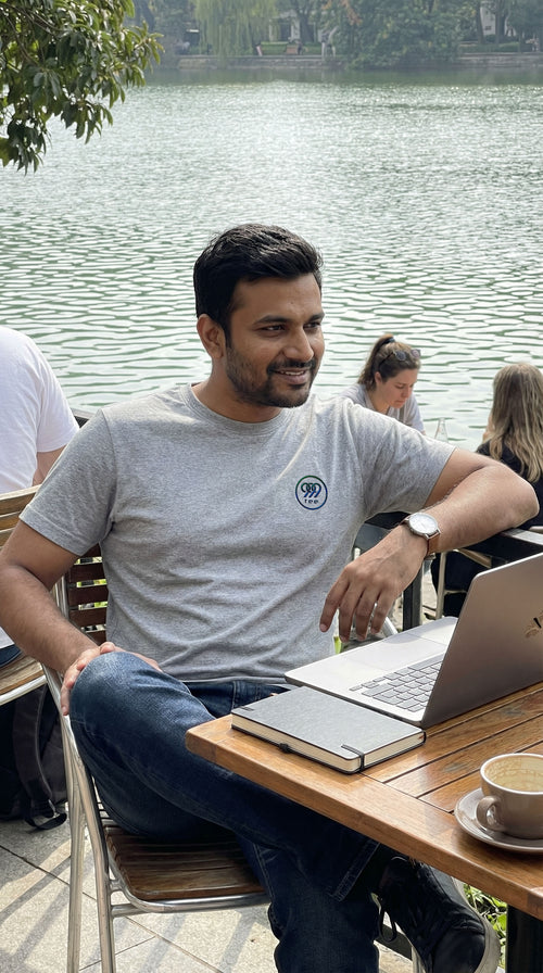 • Grey Melange T-shirt close-up with glossy 999tee chest logo detail