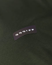 • 999tee fabric label close-up on olive apparel detail