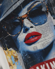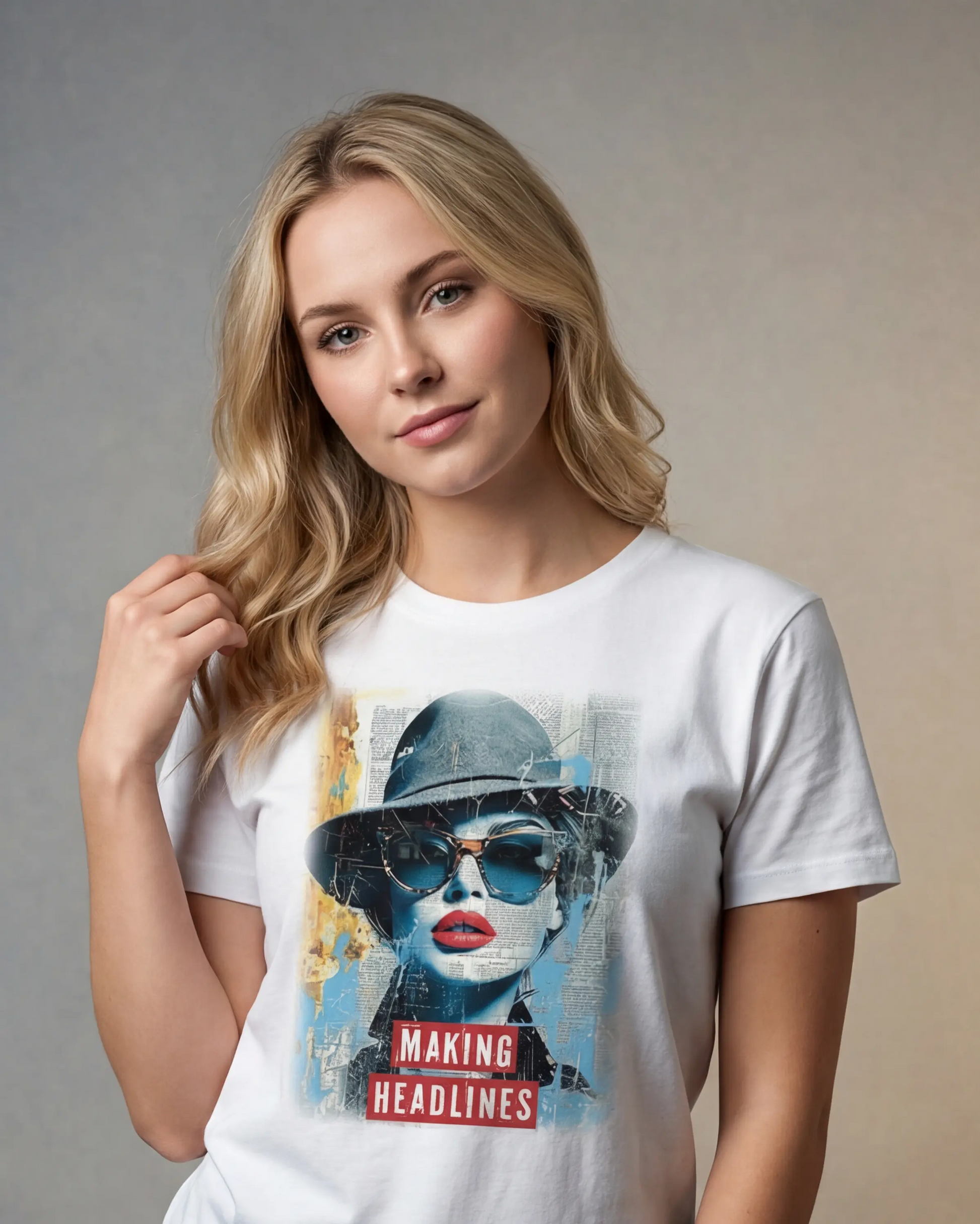 Crafted from the headlines of yesterday, this captivating t-shirt tells a story all its own. A woman, meticulously constructed from layered newsprint clippings, adorns the front of this unique white tee.
