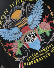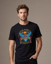 Conquer the open road with our "Iron Wheels" Men's T-shirt. The powerful phrase "Iron Wheels" boldly proclaims its presence, symbolizing rugged determination and timeless appeal.