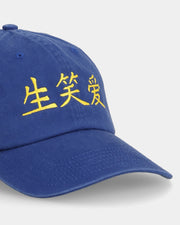 Blue dad cap embroidered with Kanji for “Live. Laugh. Love.” and matching English text on the side. A soft-spoken classic with poetic intent.