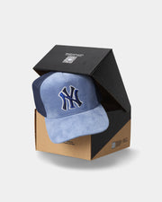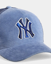 • Blue corduroy trucker cap with NY logo embroidery, front view product shot.