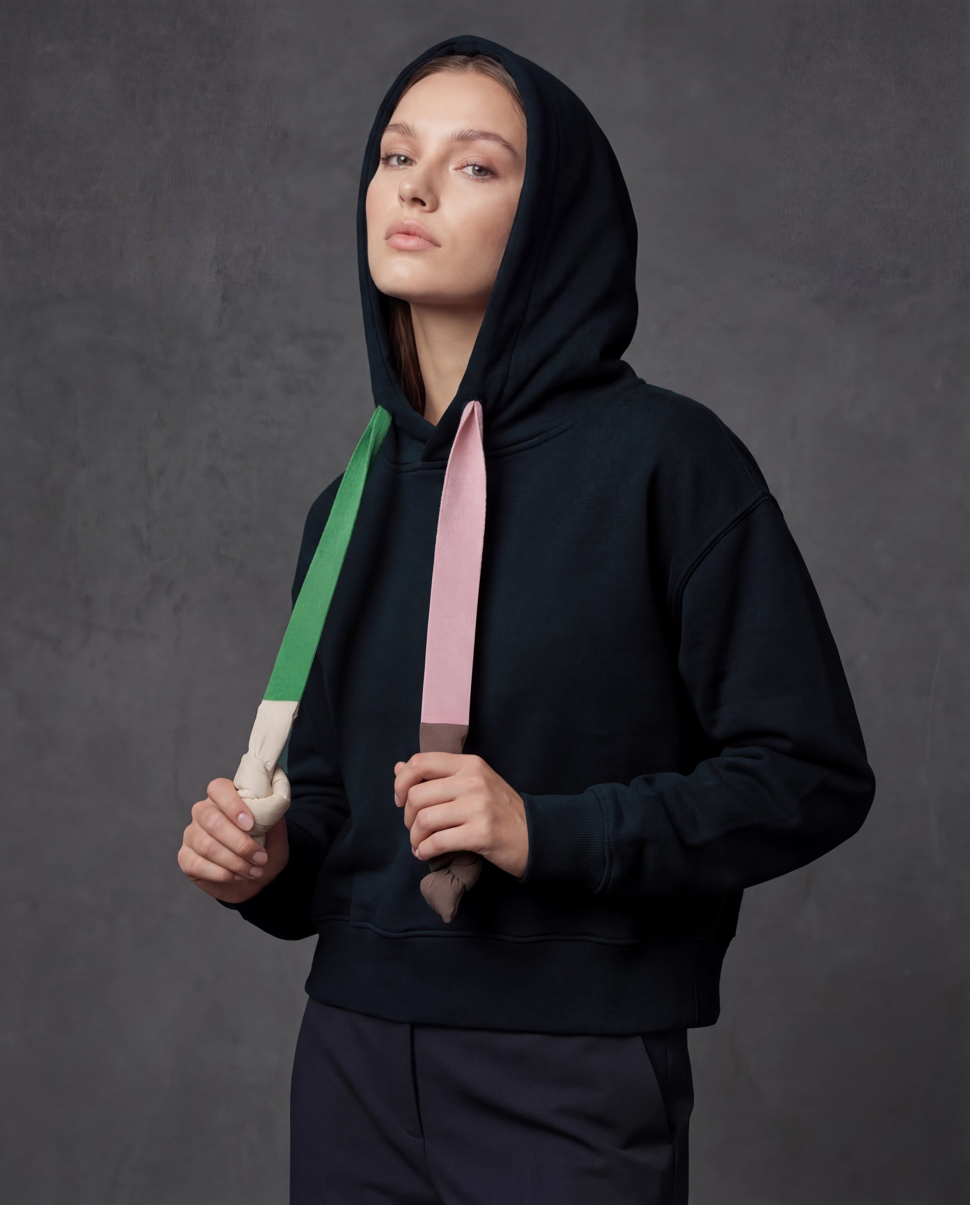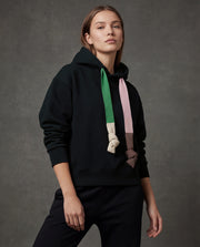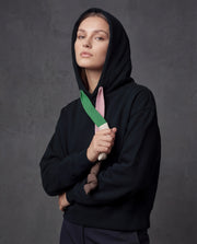 A premium black women’s hoodie with contrast pink and green drawstrings, designed for a clean statement look with everyday comfort and an elevated casual feel.
