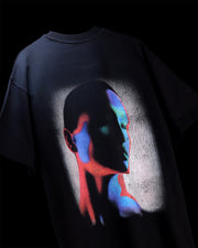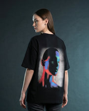 • Female model wearing Radiant Simplicity oversized T-shirt with portrait graphic, back view