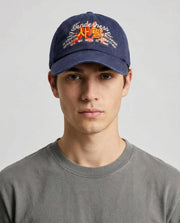 • Navy blue dad cap with embroidered text and graphics on a light gray background