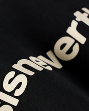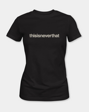 “ThisIsNeverThat” printed on black with a minimal everyday look. A regular fit women’s T-shirt in soft 95% cotton, 5% spandex fabric, finished with crisp heat transfer vinyl graphic work for daily wear.