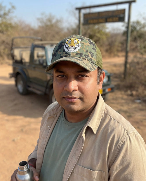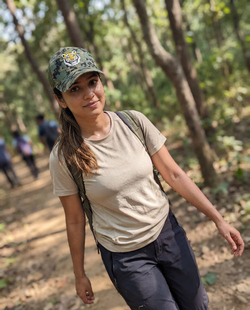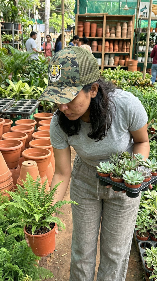• Camouflage trucker cap close-up with tiger embroidery detail